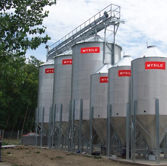 Cone-shaped silos are built on a frame, which creates a very efficient transportation route for the transport vehicle, when it is used under a row of cone-shaped grain towers. Cone-shaped silos can be mounted in such a way that a grain transporting vehicle can go under it and the transporter is filled by just opening a hatch on the bottom of a tower.