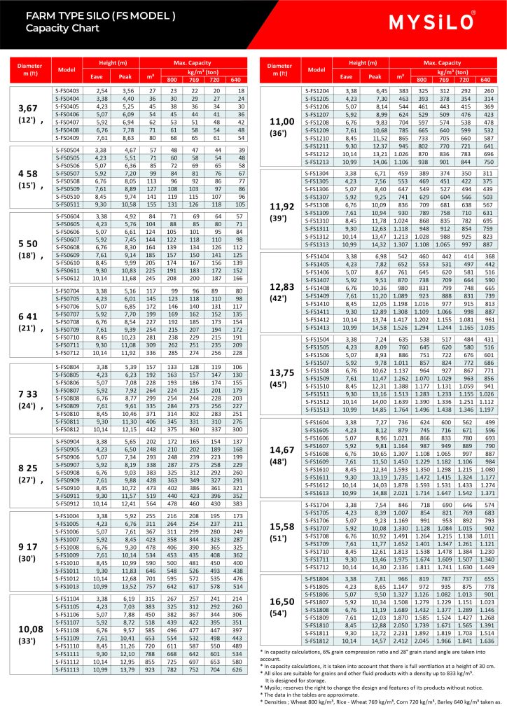Farm silos are produced in diameters ranging from 4.58m to 16.50m, with a maximum height of 14.50m and a capacity of up to 2500 m³.Sidewall Sheets: