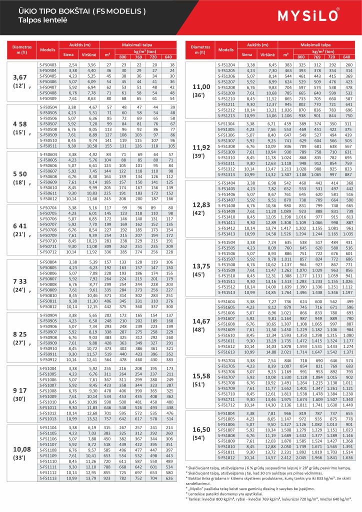 MYSiLO bokštai gaminami nuo 4,58 m iki 16,50 m skersmens, maksimalus aukštis – 14,50 m, o talpa – iki 2500 m³.