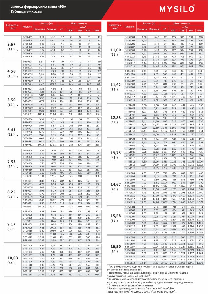 Фермерские силосы производятся диаметром от 4,58 м до 16,50 м, максимальной высотой 14,50 м и емкостью до 2500 м³.