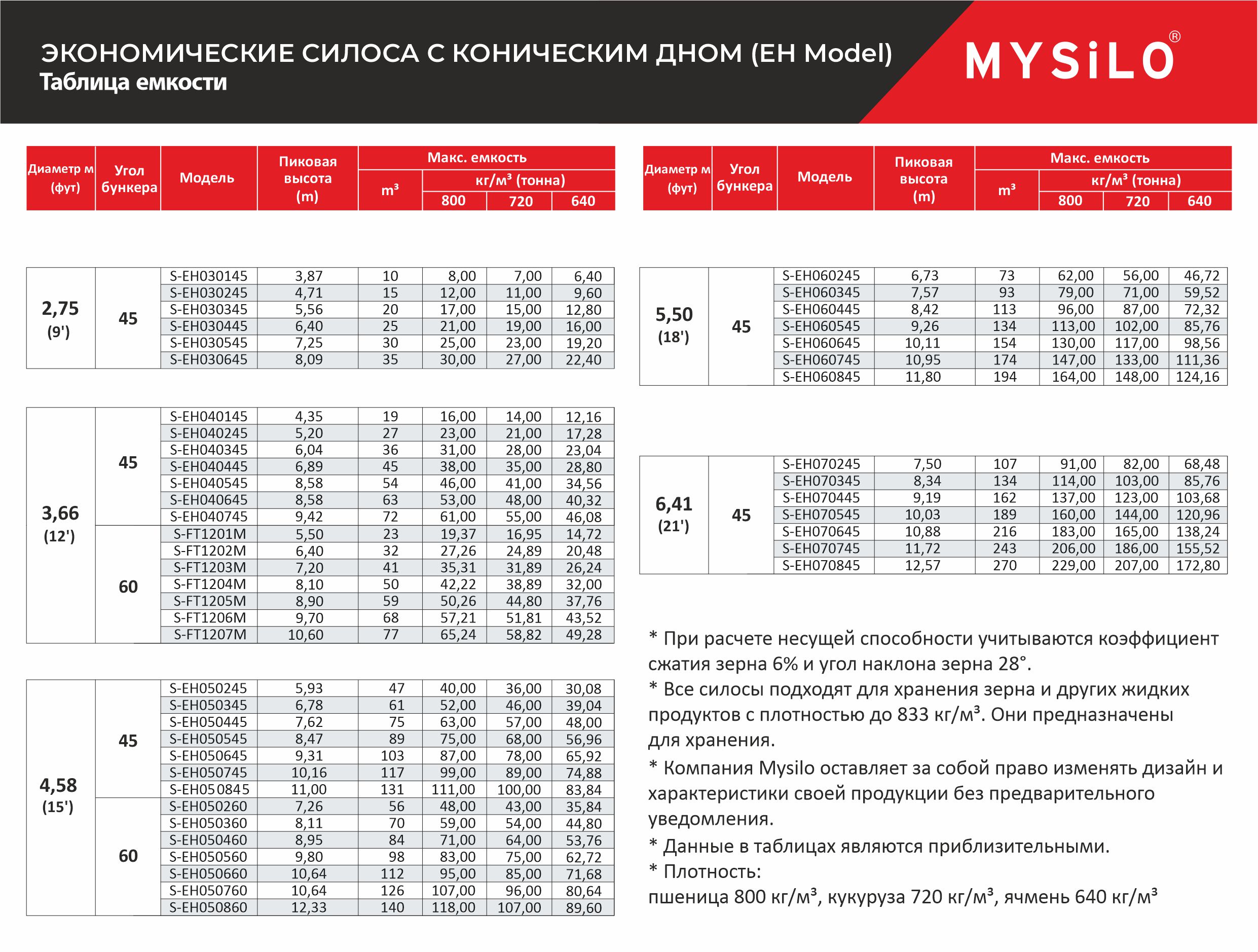 Экономические силосы с конусным дном идеально подходят для хранения зерновых в малых объемах. Экономические силосы с конусным дном Mysilo имеют диаметр от 2,75 м до 6, 41 м и спроектированы для безопасного хранения зерновых с максимальным объемом 216 м³. Они сконструированы таким образом, чтобы разгрузка происходила максимально быстро. Кроме того, что этот тип силоса не требует больших затрат на инфраструктуру, они могут иметь разные углы наклона.